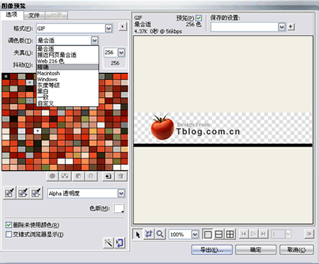 我將TOP部分切片為兩部分,第一部分包括了LOGO和一條橫線。由於LOGO圖片並沒有太多的顏色,這裡我於是將這一部分保存為GIF格式,調色板選擇為精確,選擇Alpha透明度,色版為白色(此處顏色應與背景色相同),導出為logo.gif,圖像寬度為800px。