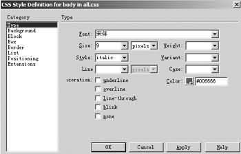 現在網頁中流行宋體的9pt和10.5pt的字體,按快捷鍵“Shift+F11”打開“CSS Style控制面板”,單擊“New Style”按鈕,彈出“New Style”對話框,復選“Redefine HTML Tag”的“Type”類型,這時在Tag處會出現“body”、“br”、“cite”等選項,選擇“body”後確認。這樣我們就建立了一個外掛的CSS文檔,在保存對話框中保存為all後就進入“Style Definition for body in all.css”對話框(如圖1)。選擇“Category”中的“Type”項,定義“Font”為“宋體”、“Size”參數為“9”,其後的下拉框選擇“Points”、“Color”自定義為喜好顏色就可以了。當然還可以選擇“Category”中的“Background”項來定義“Background”顏色和其他背景屬性。這時您會看到頁面中內容的整體改變。
