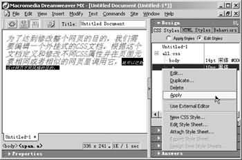 經過上面的改變有時不免給您帶來一定麻煩,如果遇到頁面中某個元素,比如突出顯示的文字的字體、字號以及顏色怎麼辦!這裡我們就需要再定義一個新的CSS樣式單來對其進行控制,右鍵點擊頁面編輯區,在彈出快捷菜單中點擊“CSS Style/Edit Style Sheet”命令,彈出“Edit Style Sheet”對話框,選擇列表中的all.css,點擊“New”按鈕,在彈出的“New Style”對話框中選擇“Make Custom Style(class)”的“Type”類型定義一個自己偏好的CSS控制。如果想更改頁面中某一元素的屬性,選中它然後右鍵單擊“CSS Styles”面板中“Apply Styles”中剛才定義的CSS,執行“Apply”命令就可以了(如圖2)。