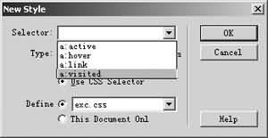 超級鏈接也是網頁中經常使用的,而網頁的鏈接色默認都是藍色,雖然可以更改,但單一色彩在不同背景色的網頁上顯示就不是那麼奏效了,我們來看一下如何用CSS控制網頁實現不同的個性鏈接顏色。在“New Style”對話框中,選擇“Use CSS Selector”的“Type”類型,在“Selector”下拉框中會列出“a:link(鏈接屬性)”、“a:hover(鼠標移動到鏈接上的屬性)”、“a:visited(鏈接被訪問後屬性)”、“a:active(鏈接焦點狀態下的屬性)”4個選項(如圖3),這4個選項的設置會控制網頁中所有的鏈接的屬性,我們可以分別定義這4個屬性,然後添加到“CSS Style”面板中與默認設置不同的CSS控制中,再將其“Apply”到需要改變的鏈接上就實現了。如果將“Hover”的字體設置的比“Link”稍微大一點,就會出現鼠標移動到鏈接上時字體變大的效果,試試看是不是很奇妙!