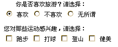 從上面的源代碼中可看出,制作單選框只要把<input>標記的type參數設置為type="radio"就行了;而制作復選框則只要把<input>標記的type參數設置為type="checkbox"就行了。至於實際應用中用那種選擇框,要根據實際需要而定。若只需用戶有一種選擇的,就用單選框,如本例中“你是否喜歡旅游?”這個問題,用戶只能是一種選擇,所以采用了單選框;若允許用戶有多項選擇的內容,則采用復選框,如本例中的“你對那些運動感興趣?”這個問題,因一個人的興趣可能是多方面的,所以采用了復選框。