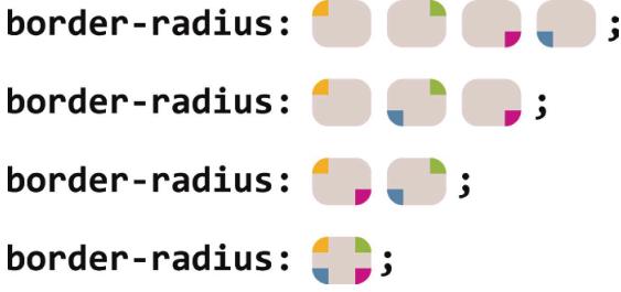 為 border-radius 屬性分別指定4、3、2、1 個由空格分隔的值時,這些值是以這樣的規律分配到四個角上的(請注意,對橢圓半徑來說,斜槓前和斜槓後最多可以各有四個參數,這兩組值是以同樣的方法分配到各個角的)