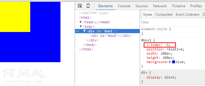 這裡一定要結合前面那張七階圖,最下面那一層便background是建立在層疊上下文的基礎上的,也就是說在層疊上下文中,所有的元素都會渲染在背景和邊框上面;在block盒子、float盒子等不存在層級上下文的元素中,子元素設置z-index為負值的時候,那麼子元素會被父元素遮擋。說了可能不太好理解,舉個栗子消化一下: