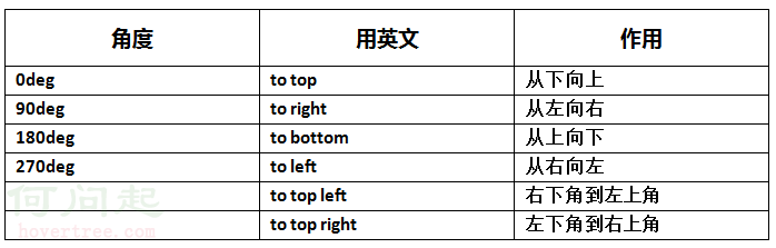 第一個參數:指定漸變方向,可以用“角度”的關鍵詞或“英文”來表示: