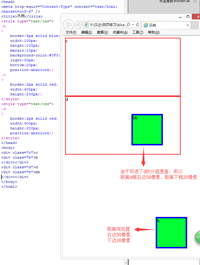 1.外層沒有position:absolute(或relative);那麼div相對於浏覽器定位,如下圖中b(距離浏覽器右邊框為50像素,距離下邊框為20像素)。
