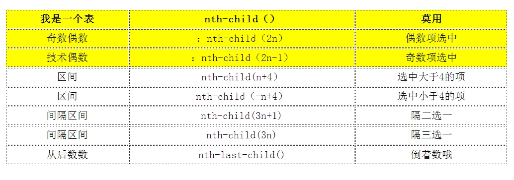 如果想選中表格中的元素,使用強大的nth-child()偽類選擇器異常方便(更加讓人著迷的是,括號中的函數表達式,可以有無限可能)