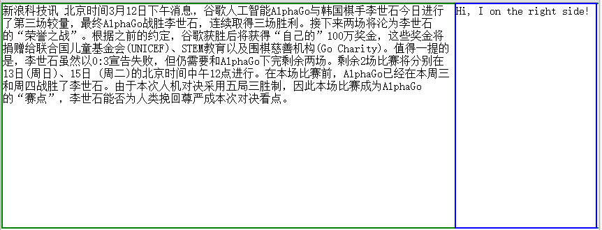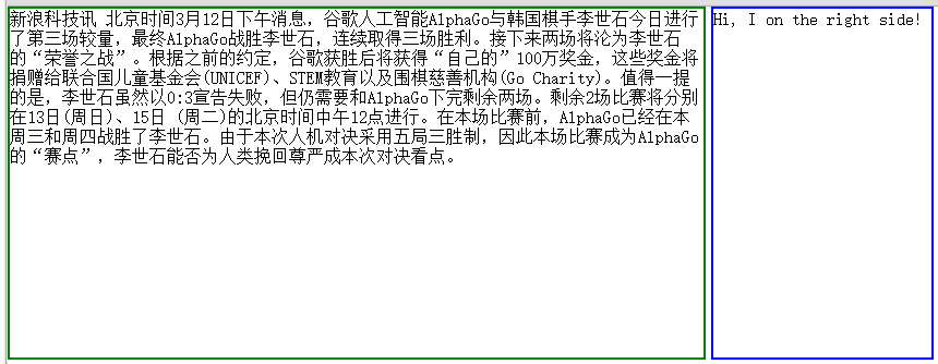 乍一看,上面的效果好像已經達到了我們的題目要求了。但是,接下bug就開始暴露出來了!就在我為自己完成了任務而高興時,就打開新浪新聞放松一下。手賤的我,看完了一條關於谷歌alphago完爆韓國頂級棋手小李的新聞時,然後隨便復制了下來,放到left裡面,這時候,我開始慌了,效果如下: