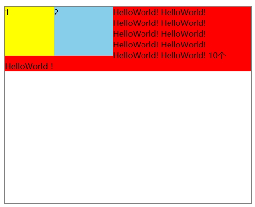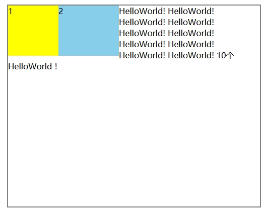 實際上,並不是P元素和1,2浮動元素並列排在了一起,在細節一二中,我們知道p元素一定是頂到1的位置中的,但是由於文字永遠是被擠出來的,所以他們被擠到2的左邊,此時實現了一個文字環繞效果。我們可以給P元素添加背景色來查看一下實際: