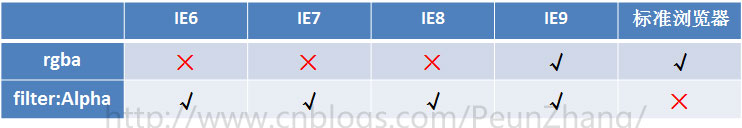 上以上3點分析可知,設置透明背景文字不透明,可采用的屬性有rgba和IE的專屬濾鏡filter:Alpha,其兼容性如下圖所示: