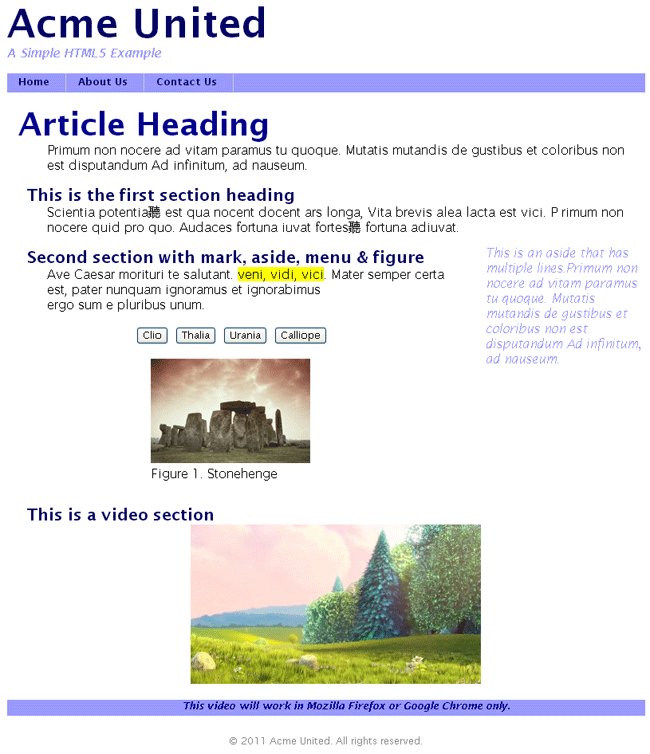 這裡使用< aside>標簽來表示的信息並非是圍繞著它的那些連續內容的組成部分。< figure>標簽包含了一個Stonehenge的圖片。< section>標簽還包含了一個< menu>標簽,該標簽被用來創建使用了四個缪斯女神的名字來命名的按鈕。當某個按鈕被點擊時,其提供相應缪斯女神的的信息。< mark>標簽被用在< p>標簽中,以此來突出顯示veni、vidi和vici等詞。