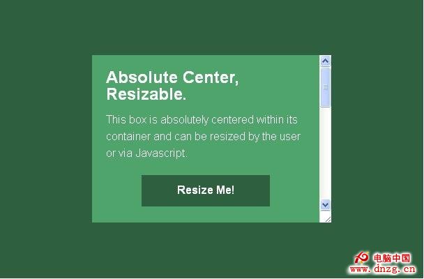 使用其他樣式,或者使用JavaScript調整內容區的大小,也是不用手動重新計算的!如果設置了resize的樣式,甚至可以讓用戶自行調節內容區域的大小。 “完全居中”法,無論內容區怎麼改變大小,都會保持居中。