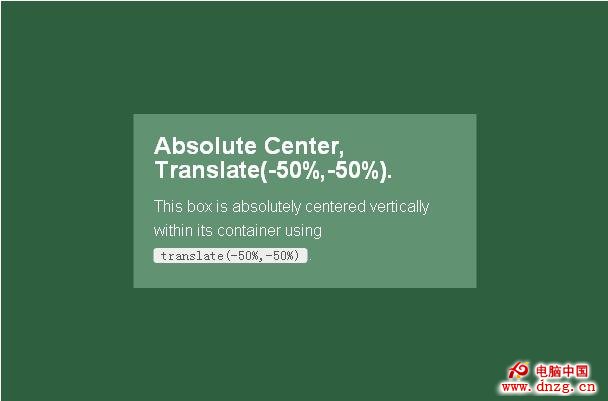 和“完全居中”法的好處一樣,簡單有效,同時支持可變高度。為內容指定帶有廠商前綴的transform: translate(-50%,-50%)和top: 50%; left: 50%;樣式就可以讓內容塊居中。