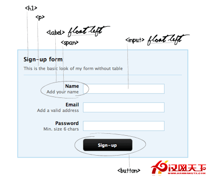 我為每個input元素使用了<label>標簽,並使用<span>標簽包含簡短的描述。所有的label和input元素都是用了CSS的float屬性,值為left。
