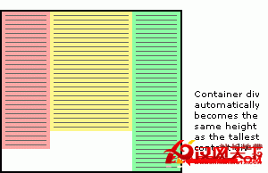 為了使用這種結構在所有游覽器都正常工作,我們必須讓外層容器往左或右浮動,並且其子元素包含每一欄內容的DIV也跟著浮動,哪一個方向都無所謂。浮動會使用它們往上對齊於外圍容器的上補白,並且浮動的容器會自動調整自身的高度與寬度以實現對浮動子元素的包含。但是如果容器被定義了高度與寬度,則它不會隨子元素的大小而自動調整自身顯示區域來適應子元素的顯示。但在IE6與低版本的IE中,子浮動元素能撐開外圍元素;幸好IE7與IE8已引正了這個不符合標准的做法。
