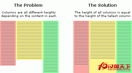 如上圖所示,由於各列的內容不一致導致其背景的高度也不統一。而背景實質上是內容(標准的盒子模型是由內容區,補白區,邊框區與邊界區組成,背景存在於前三者中;IE為前兩者)的自適應的問題。再轉化一下,如何撐大那些較短的列的高度,讓所有列的高度等於最高的列的高度?這個,的確很很棘手,因為我們不清楚各列的高度,也無從得知哪一列最高。我們也不能簡單地給所有列一個明確的高度,這可能會導致所有列都多出一大片空白,或者很不虧由於高度不足導致某些列的內容無法全部顯示出來!現實中,內容的長度是動態的,因此每列的高度也是動態的。我們必須意識到在網絡中,不存在”固定“二字,每個人的顯示器的分辯率都不盡一樣,游覽器的字體大小設置也不盡相同,這些都會影響到內容的顯示高度。