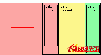 現在是所有容器都完美地累在一起,只顯示一種背景顏色,我們必須讓其他背景也顯示出來。為此我們就得利用相對定位來讓這些容器像階梯一樣放置。這個本可以使用負邊界技術,但該死的IE5.5的盒子模型與W3C的不一致,為了兼容我們就得使用到 hack。由於本文聲明是不使用CSS hack,因此放棄。首先讓#container2向右移到30%,由於#container2裝著#container1,而#container1上裝著那三個列,這樣一來,最右邊的列就被移出游覽器的右邊了。而最外圍最底層的容器#container3則露出來了,露了左邊的30%。然後我們再移動最上層的容器#container1,向右邊移動40%,於是原來蓋住的第二層容器也露出來了,露出其左邊的40%,而#container1則只剩下100%-30%-40%=30%;上方的列也只剩下最右邊的列,卻表現為位於最左邊。這樣,背景也顯示正常了!