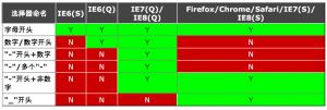 從上面看到,我們可以直觀的了解到選擇器的命名在各浏覽器下的支持情況有所不同。因此,如果選擇器的命名不規范,將影響各浏覽器下,樣式渲染不一致。比如如下代碼:
