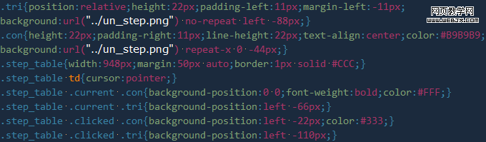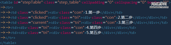 三種基本狀態:默認、當前、已完成,在TD標簽上都一一對應。除第一步沒加<div class=”tri”>尖角標簽,其他步驟內部均一摸一樣。