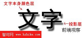 我把.text層相對定位,.text:after絕對定位疊在它上面,因為樣式一樣,所以說文字是完全重疊的,然後就用text-shadow來做效果,文字自身的顏色比投影的高,如圖: