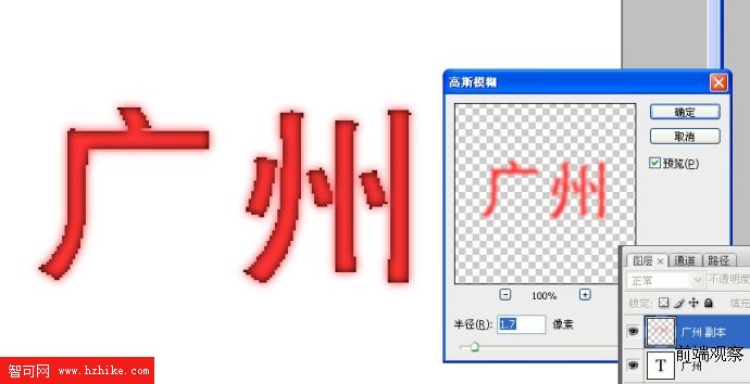 下面是一個“廣州”的黑色純文本文字,然後我復制多一個圖層出來柵格化然後高斯模糊它,結果模糊層透過下面看到部分黑色純文本文字與上面的紅色半透明區域融合,視覺上有點內陰影的感覺。這個就是我實現 純CSS3內發光的原理:一個.text純文字層,一個.text:after層疊在上面投影產生內發光視覺錯覺,這個也就是為什麼要設置文字顏色透明的 原因,假如文字本身有顏色,那麼就會擋住半透明,這樣背景色就給擋住了,跟普通投影沒區別。不過這個方法有瑕疵,而且很致命,就是羽化多出邊界的會有羽化 的紅色,如果投影紅色換成白色,這樣跟背景融合,效果沒話說,但是如果用與底色區別太明顯的顏色,這樣就惡心了,不過可以調節成為“外發光”效果,事在人為。