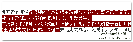當然,我們可以使用CSS選擇器指定特定標簽內容文字選中後的樣式狀態,例如下面所展示的栗色選中狀態: