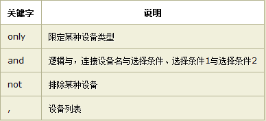 從上面的例子可以看出,字符間以空格相連,選取條件包含在小括號內,srules為兼容設置的樣式表,包含在中括號裡面。only(限定某種設備,可省略),and(邏輯與),not(排除某種設備)為邏輯關鍵字,多種設備用逗號分隔,這一點繼承了CSS基本語法。