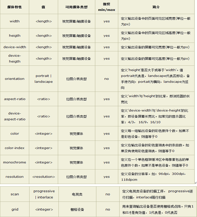 上面使用中only可省略,限定於計算機顯示器,第一個條件max-width是指渲染界面最大寬度,第二個條件max-device-width是指設備最大寬度。