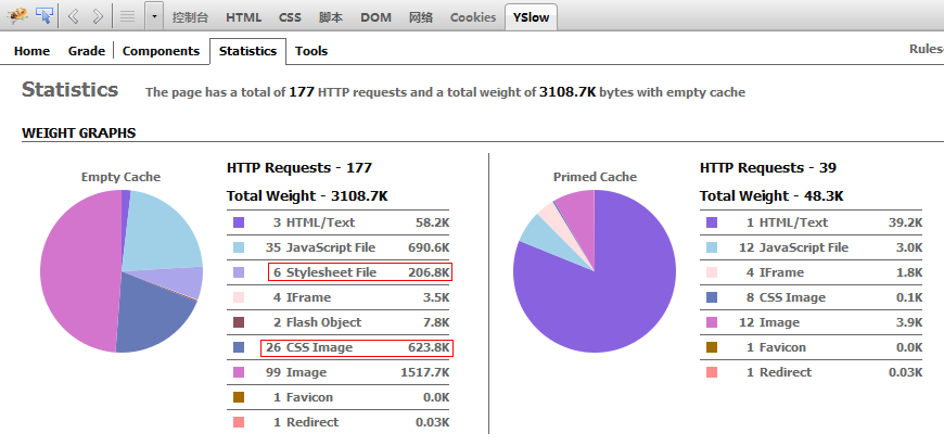 首先我們通過yslow的statistics查看新浪微博最新版首頁的文件,得到Stylesheet File(CSS文件)大小為206.8K, CSS Image大小為623.8K。明顯發現CSS文件比CSS Image小很多。