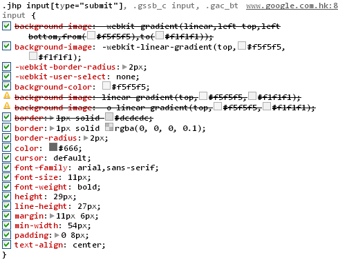GOOGLE搜索這個按鈕沒有使用濾鏡,IE浏覽器就沒有做漸變處理,大家都知道GOOGLE是非常在意性能的公司,有些時候為了極致的性能,稍微犧牲一下視覺體驗也是可以接受的。