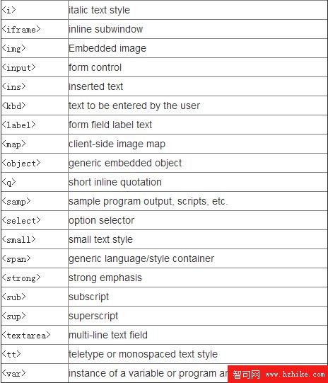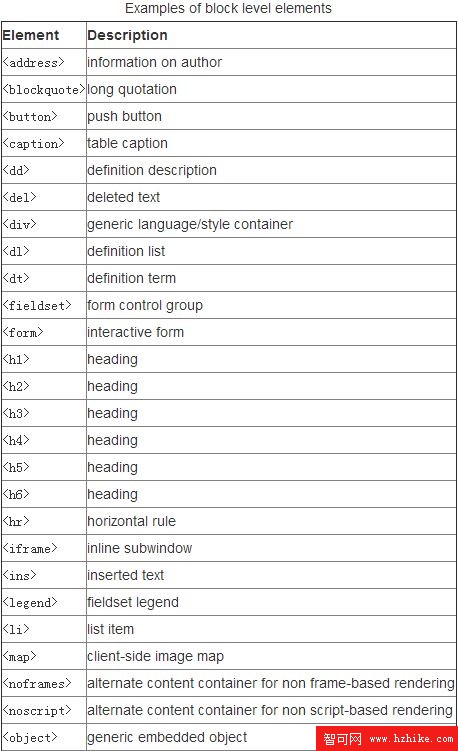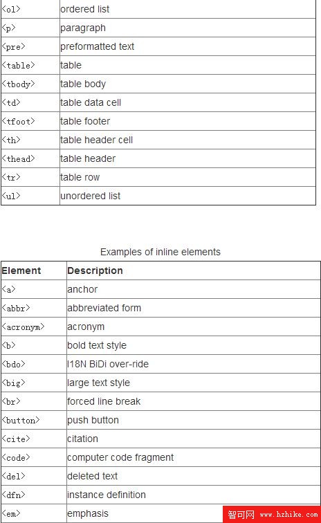 C:一般的塊級元素諸如段落<p>、標題<h1><h2>...、列表,<ul><ol><li> 、表格<table>、表單<form>、DIV<div>和BODY<body>等元素。而內聯元素則如:表單元素<input>、超級鏈接<a>、圖像<img>、<span> ...
