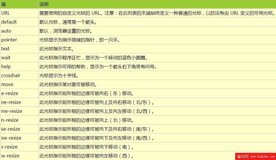 下表列出了該屬性所有的值: 鼠標可移入對應的屬性值,查看光標的形狀。