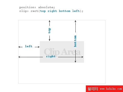 剪輯(clip)屬性就像一個面具。它允許你使用矩形掩蓋頁面元素的內容。要剪輯一個元素:你必須指定其position屬性為absolute,然後指定相對於元素的top,right,bottom,left值。