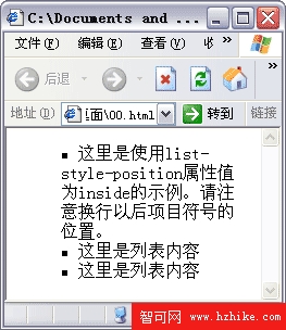 - <li>這裡是使用list-style-position屬性值為inside的示例。請注意換行以後項目符號的位置。< span>li>