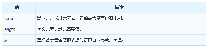該屬性值會對元素的高度設置一個最高限制。因此,元素可以比指定值矮,但不能比其高。不允許指定負值。