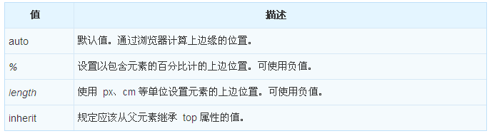 top 屬性規定元素的頂部邊緣。該屬性定義了一個定位元素的上外邊距邊界與其包含塊上邊界之間的偏移。