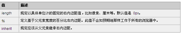 該屬性設置元素右內邊距的寬度。行內非替換元素上設置的右內邊距僅在元素所生成的第一個行內框的右邊出現.