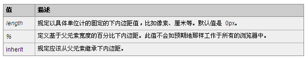 該屬性設置元素下內邊距的寬度。行內非替換元素上設置的下內邊距不會影響行高計算,因此,如果一個元素既有內邊距又有背景,從視覺上看可能延伸到其他行,有可能還會與其他內容重疊。不允許指定負內邊距值。