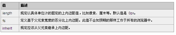 該屬性設置元素上內邊距的寬度。行內非替換元素上設置的上內邊距不會影響行高計算,因此,如果一個元素既有內邊距又有背景,從視覺上看可能延伸到其他行,有可能還會與其他內容重疊。不允許指定負內邊距值。