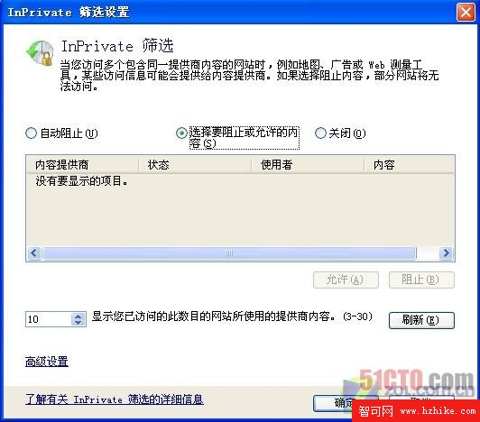 同時,你也可以通過InPrivate篩選控制允許哪些提供商接受網站的訪問信息,如果選擇阻止共享信息,則這些被訪問的網站中的某些內容將無法使用。