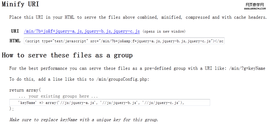 點擊Update之後,系統會自動生成一個合並後的URI:/min/?b=js&f=jquery-a.js,jquery-b.js,jquery-c.JS。如果覺得URI太長,可以通過配置文件來指定group,編輯min目錄下的groupsConfig.PHP文件,加入以下內容: