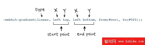 以下代碼適用於 webkit 引擎的浏覽器,如 Safari,Chrome 等。它會從頂部 (#ccc) 到底部 (#000) 呈現一個線性漸變。