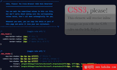 CSS3 Please一個在線生成跨浏覽器的CSS3代碼的網站,很直觀,也很方便,現在支持的CSS 3屬性有圓角、陰影、漸變、自定義字體、旋轉、rgba色彩。即將支持的還有其他的一些 CSS transform。