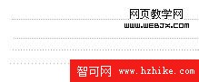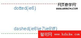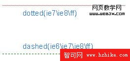 (二)頁面制作中虛線實現 效果圖設計的完美固然重要,但是最終還是要精確還原設計稿,css中的dotted(點線)在IE6下顯示和其它浏覽器不同,而且點過於密集效果不是很理想。dashed(虛線),雖然浏覽器表現相同,但是虛線單元寬,也不是我想要的效果。單獨使用圖片來完成虛線,又會產生多余標簽,這點讓人很糾結。看下面用CSS定義的虛線: