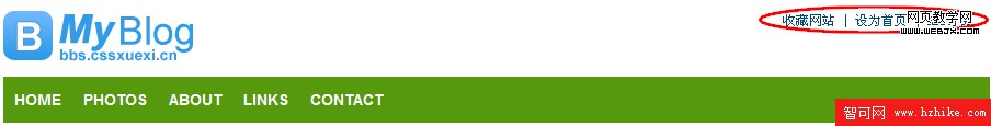 什麼?CSS代碼多了?的確,由原來的兩句話,變成現在的四句,但是有沒有發現,就靠Position我們就可以將Logo隨意的定位於任何一個地方!這就是它的靈活的地方!如果在頁面頂部在有一行“加入收藏 | 設為首頁 | RSS訂閱”如下圖,你是不是也可以很方便的將它們定位於右上角呢~