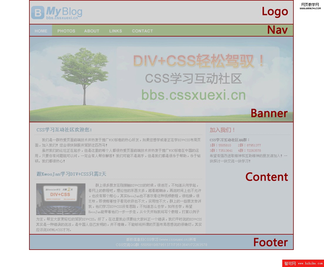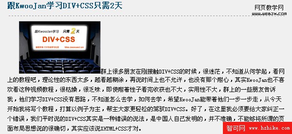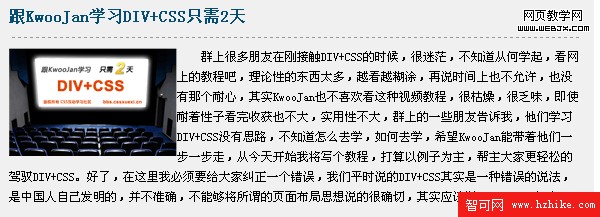 <img src="Images/1.gif" />群上很多朋友在剛接觸DIV+CSS的時候,很迷茫,不知道從何學起,看網上的教程吧,理論性的東西太多,越看越糊塗,再說時間上也不允許,也沒有那個耐心,其實KwooJan也不喜歡看這種視頻教程,很枯燥,很乏味,即使耐著性子看完收獲也不大,實用性不大,群上的一些朋友告訴我,他們學習DIV+CSS沒有思路,不知道怎麼去學,如何去學,希望KwooJan能帶著他們一步一步走,從今天開始我將寫個教程,打算以例子為主,幫主大家更輕松的駕馭DIV+CSS。好了,在這裡我必須要給大家糾正一個錯誤,我們平時說的DIV+CSS其實是一種錯誤的說法,是中國人自己發明的,並不准確,不能夠將所謂的頁面布局思想說的很確切,其實應該說XHtml+CSS才對。