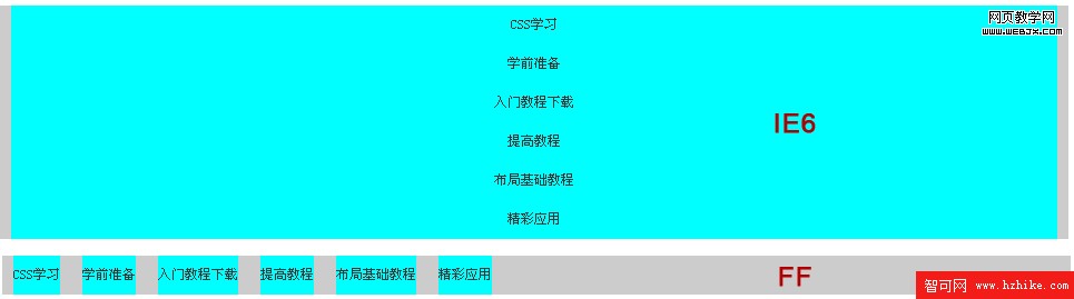 效果作出來了沒有,下面是在IE6和FF中顯示效果(其他浏覽器效果大家自己測試,總結規律):