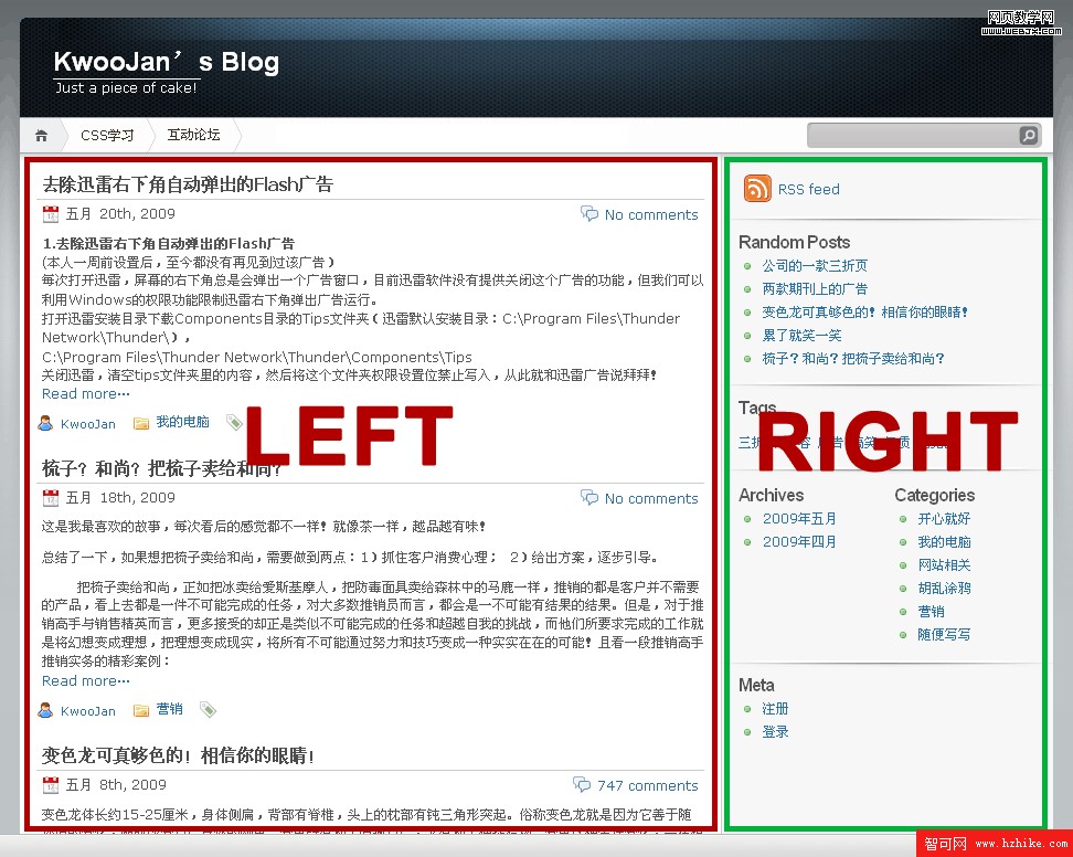 到這裡,大家應該明白Float的作用了吧,就是為了消除塊狀元素“霸權主義”的一把利器!在布局頁面的時候有時候是需要消除塊狀元素霸權主義才能布局好喲,比如KwooJan的博客中間內容部分,分為左邊(LEFT)和右邊(RIGHT),就是要用上面這個方法布局的喲,如下圖