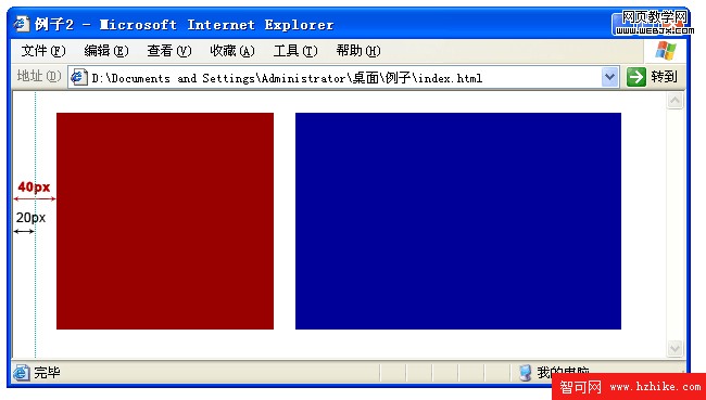 細心的同學會注意到,在IE6中紅色方塊距離浏覽器的左邊距並不是CSS代碼中定義的20像素,而是40像素,如下圖: