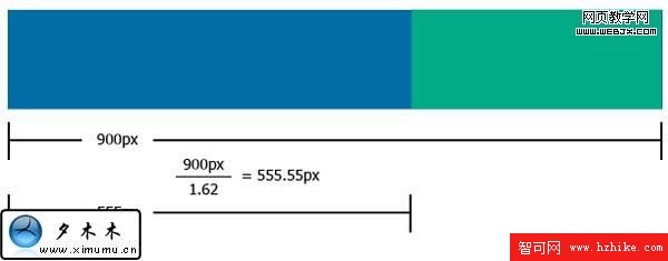使用黃金分割是非常簡單的。比如你像找到你主要內容和sidebar列表的寬度。你將使用你內容區域總的寬度除以 1.62. 然後得到555.55px. 我們不需要那麼精確,所以我們就用555px。現在你就知道你的主要內容元素是555px的寬度,你的sidebar是345px。看看多麼容易?!