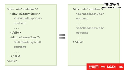 Example 2:有時候我們會給內容添加一個額外的<div>標簽來以示這是一個內容.在事例中用了<div class="sidebox">來包括內容區.如果一個內容有一個標題的話(如:<h4>),那麼我們就可以把這個<h4>來代替<div>.